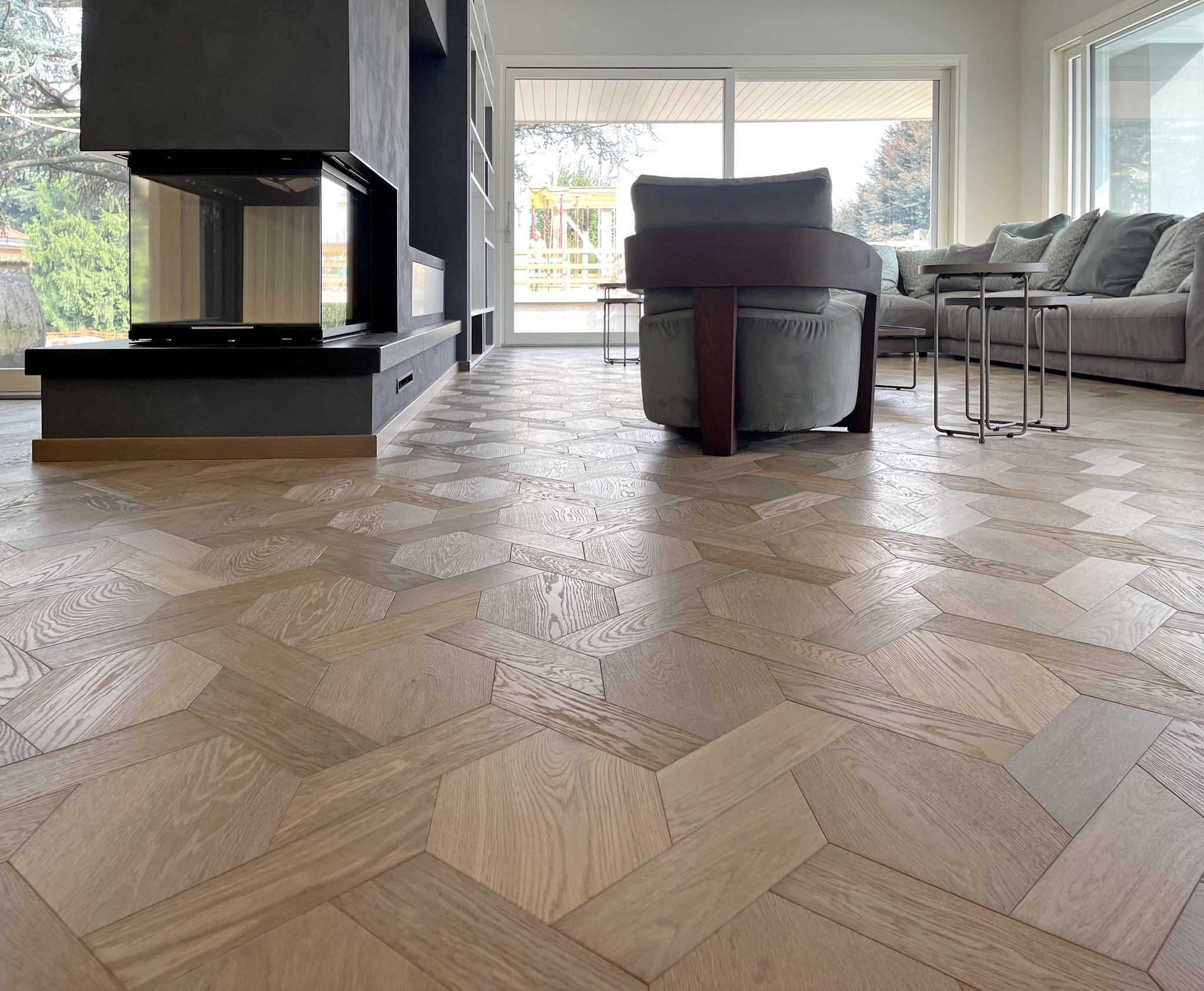 Engineered wood flooring, herringbone parquet, chevron parquet, mosaic modular parquet, decking materials, strip panels, acoustic panels, wall panels, WPC composite decking materials.